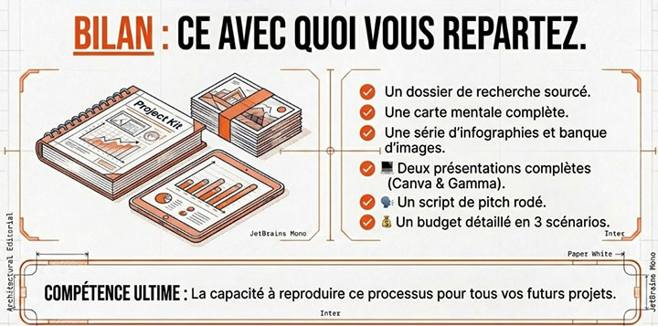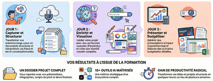 Chaque session de 2 heures est centrée sur un outil ou une compétence spécifique, et chaque participant.e travaille en temps réel sur son propre projet professionnel. À la fin des 3 jours, vous repartez avec un projet complet et opérationnel — et surtout avec la méthode pour le reproduire sur tous vos projets futurs.
