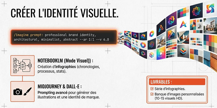 Générez des images et illustrations avec l’IA pour créer une identité visuelle cohérente. DALL-E via ChatGPT pour les images conceptuelles, Midjourney pour aller plus loin. Techniques de prompting visuel.