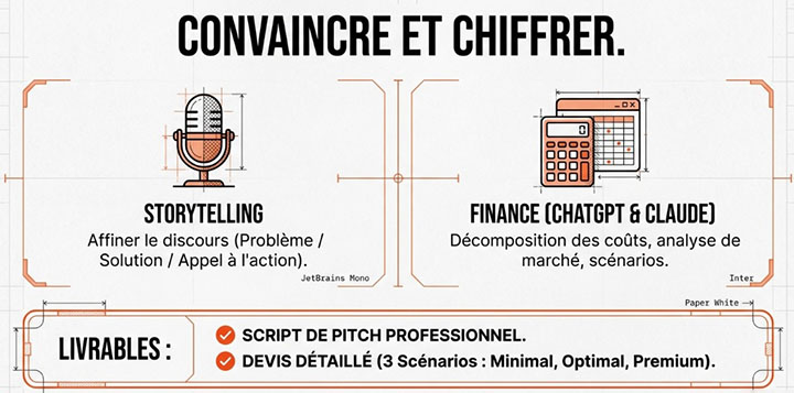 Créez des devis détaillés et professionnels avec l’aide de l’IA. Structure d’un devis, décomposition des coûts, vérification de la cohérence, recherche de données de marché pour justifier les tarifs. Création de 3 scénarios budgétaires (minimal, optimal, premium).