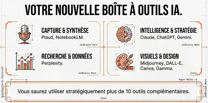 - Vous maîtriserez un écosystème de 10+ outils IA complémentaires et saurez choisir le bon outil au bon moment.