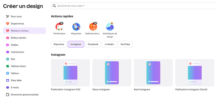 CANVA est un logiciel de création graphique de plus en plus polyvalent et puissant. Sa vocation première est de concevoir aisément des publications pour les réseaux sociaux : modèles de posts, reels, bannières Instagram, Youtube, Facebook, Linkedin, Whatsapp… Canva permet d’effectuer ces publications de façon facile et rapide, notamment grâce aux très nombreux templates disponibles. Bonus : des fonctionnalités d’animation et de génération d’images et vidéos par IA !
